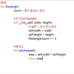 --- 클래스 클래스는 메서드, 속성, 클래스 변수, 초기자, 소멸자 등의 여러 맴버들을 가질수 있다. 예) # 결과 -> r = Rectangle(2,3) 객체 r을 생성하였다. -> area = r.calcArea() area 변수에 r객체의 가로 x 세로 값을 대입 -> r.width와 r.height의 값을 대입하여 area 변수의 값변동 확인 -> r2 객체를 만들게되면 전체 count의 수가 총 2개를 만들게 되었으므로 2가된다. -- 메서드 : 클래스 내의 함수 클래스의 행위를 표현하는 것으로 클래스 내의 함수로 볼 수 있다. 해당 클래스와 관련된 어떤 행위를 표현하는 함수이다 함수와 다르게 항상 첫번째 파라미터로 해당 클래스 객체를 나타내는 "self"를 갖는다. --예제에서 calcAre..