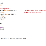함수와 if문을 배운것을 바탕으로 윤년구하는 함수를 만들어 사용해보자. 한가지 문제를 풀어보자 n과 x와 a를 입력하고 a에 입력한 a원소중 x보다 작은원소 검출 n과 x는 한가지 정수이고 a는 여러가지 정수가 될 수 있다. 파이썬에서는 변수에 값을 대입할때 x,y = 1,2 또는 x,y = [1,2] 또는 x,y = (1,2) 리스트형과 튜플형으로 변수에 값을 대입할 수 있다. split을 이용해 list형으로 바꾸고 input으로 입력받는 형태는 문자열이므로 정수로 바꿔준다. a는 여러가지 정수를 입력받을수 있으므로 split으로 list형으로 분리한 a전체를 한꺼번에 정수형리스트로 바꿀수있다. 이때 list(map(int, a))를 이용한다. for문을 사용해 문제를 풀어보자 -> a는 list형 ..